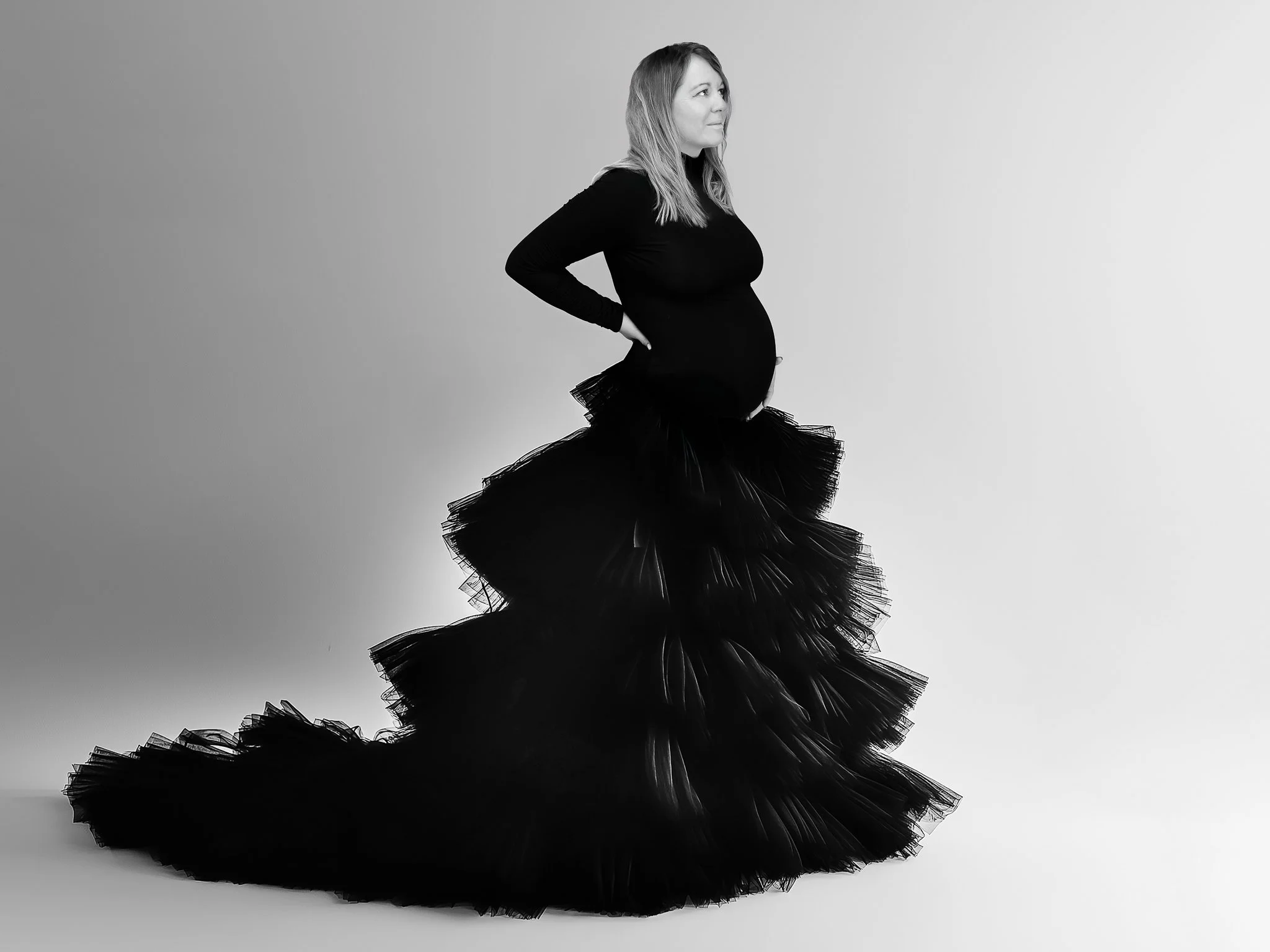 Avant la séance, vous choisissez le fond souhaité : blanc (lumineux, épuré) ou noir (intemporel, élégant). Je viens avec le fond sélectionné, d'une largeur de 1,50 m.